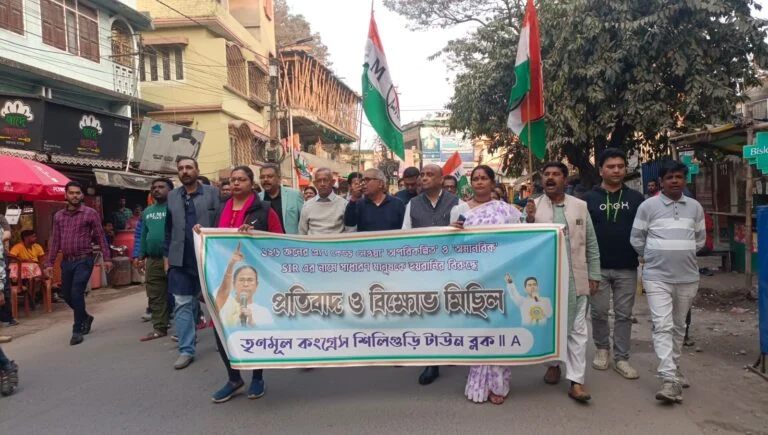 सिलीगुड़ी। विशेष सघन पुनरीक्षण अभियान (एसआईआर) के नाम पर आम जनता को परेशान किए जाने के विरोध में सिलीगुड़ी में तृणमूल कांग्रेस ने विरोध रैली निकाली गई। रविवार को तृणमूल कांग्रेस सिलीगुड़ी टाउन ब्लॉक-2 की पहल पर इस रैली निकाली गई।