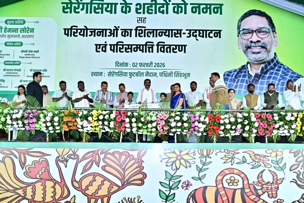 चाईबासा: मुख्यमंत्री हेमंत सोरेन पश्चिमी सिंहभूम जिलांतर्गत टोटो प्रखंड में आयोजित सेरेंगसिया के शहीदों को नमन-सह-परियोजनाओं का उद्घाटन-शिलान्यास एवं परिसंपति वितरण समारोह में सम्मिलित हुए। इस दौरान उन्होंने कहा कि आज का दिन हम सभी के लिए काफी महत्वपूर्ण और ऐतिहासिक है। हर वर्ष की भांति इस बार भी शूरवीरों की धरती-सेरेंगसिया में अपने अमर वीर शहीदों को नमन और श्रद्धांजलि अर्पित करने के लिए एकत्रित हुए हैं। यह दिन हमें अपने वीरों के बलिदान की गाथा को याद दिलाता है । इस अवसर पर हम सभी अपने अमर वीर शहीदों के आदर्श और सपनों को पूरा करने का संकल्प लें।