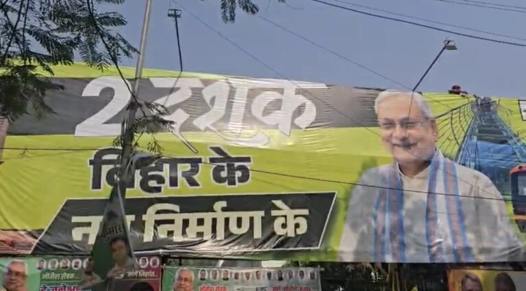 नए पोस्टर में “दो दशक बिहार के नव निर्माण के” स्लोगन को प्रमुखता दी गई है। इसमें सभ्यता द्वार, बापू टावर समेत राज्य में हुए विकास कार्यों को दर्शाया गया है।