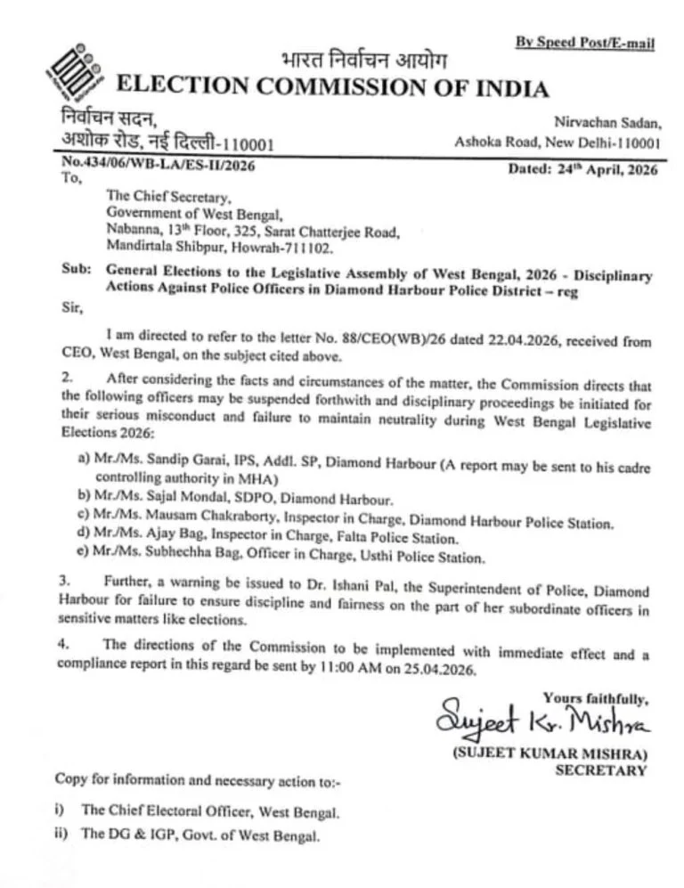 कोलकाता: भारत निर्वाचन आयोग ने पश्चिम बंगाल विधानसभा चुनाव 2026 के दौरान बड़ी कार्रवाई करते हुए 5 पुलिस अधिकारियों को निलंबित कर दिया है। इन अधिकारियों पर चुनावी ड्यूटी के दौरान गंभीर अनुशासनहीनता और निष्पक्षता बनाए रखने में विफल रहने के आरोप हैं।