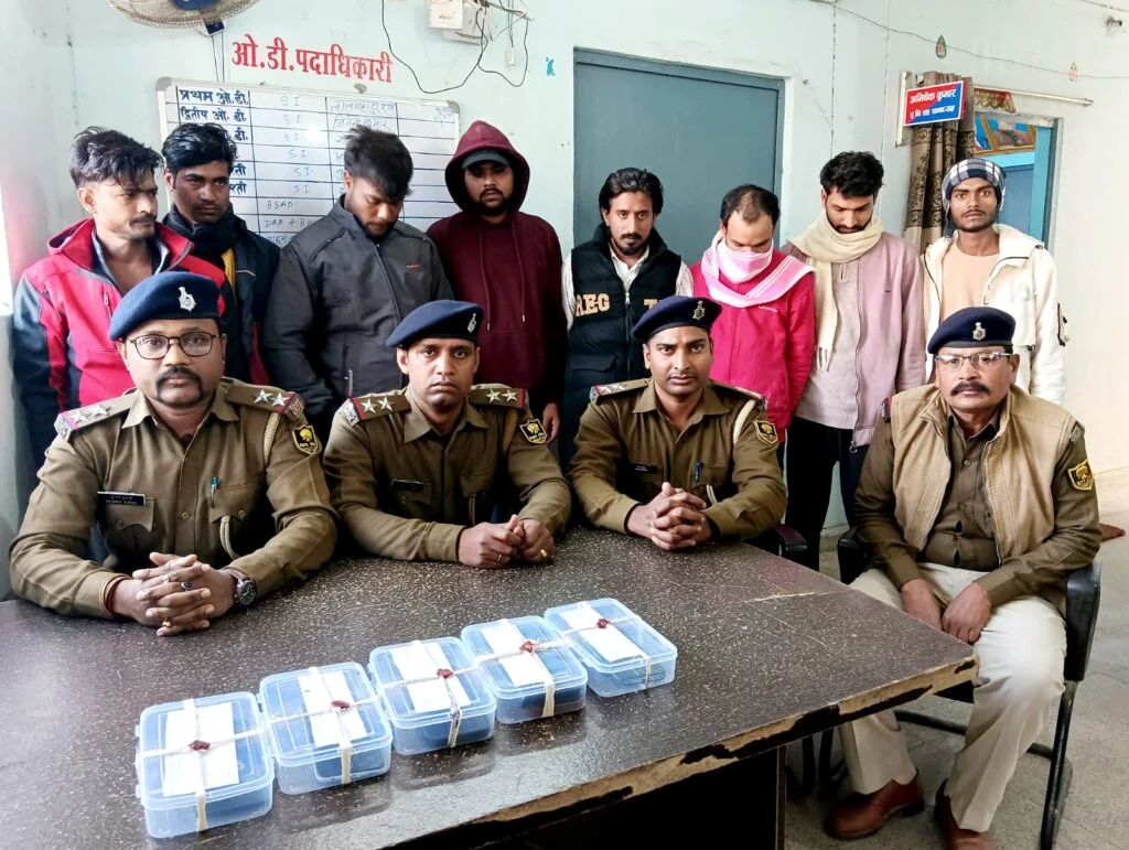 सूचना के आलोक में टीम ने त्वरित कार्रवाई करते हुए पलनवा थाना क्षेत्र के जैतापुर निवासी चंदन सिंह के पुत्र अभिषेक सिंह तथा नगर परिषद क्षेत्र के प्रभु राय के पुत्र विशाल कुमार को मौके से गिरफ्तार किया। पूछताछ और उनकी निशानदेही पर पुलिस ने आगे कार्रवाई करते हुए भेलाही थाना क्षेत्र के जयमंगलपुर निवासी विनय कुमार के पुत्र मुन्ना कुमार, डंकन रोड निवासी मुकेश सिंह के पुत्र सोनू सिंह, हरैया थाना क्षेत्र के पनटोका निवासी श्याम पटेल के पुत्र बबलू कुमार,पश्चिमी चंपारण के बलथर थाना क्षेत्र के प्रमोद सिंह के पुत्र सोनू सिंह, पलनवा थाना क्षेत्र के सौनाहा निवासी सोनेलाल यादव के पुत्र रवि कुमार यादव तथा हरैया थाना क्षेत्र के सिंघपुर निवासी मुमताज मियां के पुत्र जहीर आलम को गिरफ्तार किया गया।
