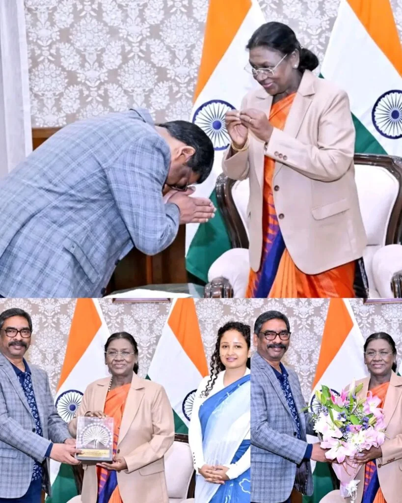 रांची। झारखंड के मुख्यमंत्री हेमंत सोरेन और विधायक कल्पना सोरेन मुर्मू ने मंगलवार की सुबह लोकभवन में राष्ट्रपति द्रौपदी मुर्मू से मुलाकात की। यह एक शिष्टाचार भेंट वार्ता थी। मुख्यमंत्री ने झुककर उनको जोहार किया और मोमेंटो भेंट की।