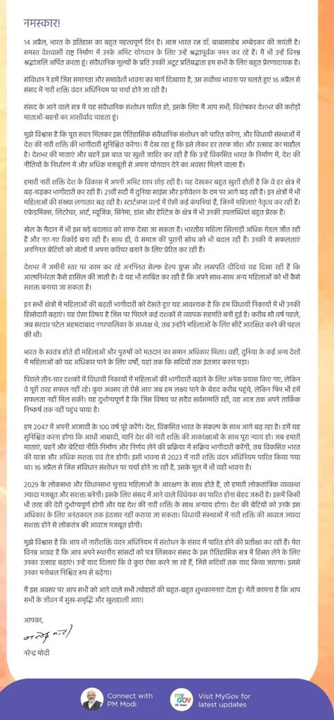 Narendra Modi ने अपने पत्र में कहा कि देशभर की माताएं, बहनें और बेटियां वर्ष 2029 के चुनावों से महिला आरक्षण लागू होने के निर्णय का स्वागत कर रही हैं। उन्होंने महिलाओं से अपील की कि वे इस विधेयक के समर्थन में अपने-अपने सांसदों को पत्र लिखें।