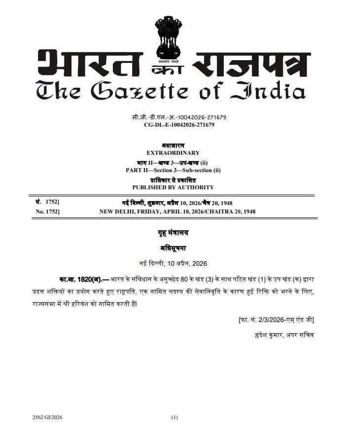 नई दिल्ली : वरिष्ठ पत्रकार और राजनेता हरिवंश नारायण सिंह एक बार फिर राज्यसभा पहुंचने जा रहे हैं। इस बार उन्हें उनकी पार्टी JDU ने टिकट नहीं दिया, लेकिन राष्ट्रपति द्रौपदी मुर्मू ने संविधान के तहत नामित कर उच्च सदन में भेज दिया। यह फैसला ऐसे समय आया है जब उनका कार्यकाल 9 अप्रैल 2026 को समाप्त हो चुका था और उनके राजनीतिक भविष्य को लेकर अटकलें तेज थीं।